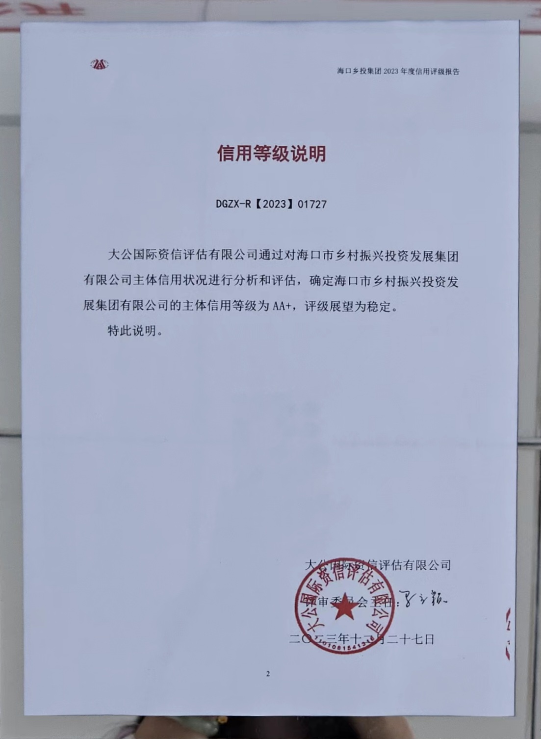 AA+信用主體信用等級(jí)